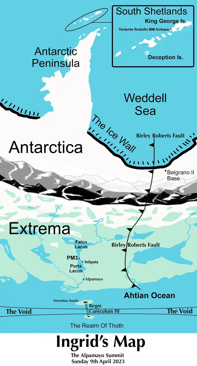 Their aim was to release waters from the Ahtian Ocean, a vast body of water way beyond the ice wall and Antarctica. This ocean completely encircles Antarctica and its waters are two-hundred feet or so above those of Earthland’s which, were they somehow to be released, would raise the Atlantic, Pacific et al by over one-hundred feet, killing millions, if not billions in the process.